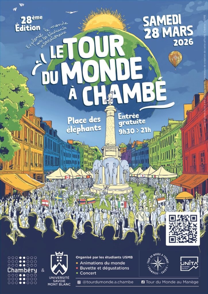 Le temps d’un samedi, le 28 mars 2026, Chambéry se pare des couleurs du monde avec Le Tour du Monde à Chambé ! Cet événement unique invite les habitants à un voyage immersif à travers les cultures mondiales. Grâce à des discussions, des dégustations et des animations proposées par les étudiants internationaux de Chambéry, vous pourrez découvrir des cultures fascinantes.