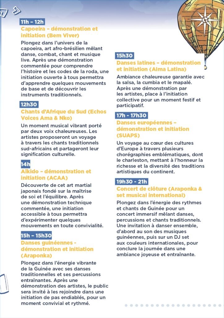 Nous attendons une centaine d’Ă©tudiants pour vous faire voyager en partageant les traditions, la musique, la danse et la gastronomie de leurs pays. Stands interactifs, dĂ©monstrations artistiques, ateliers crĂ©atifs et activitĂ©s sportives rythmeront ces deux jours placĂ©s sous le signe de la convivialitĂ© et de l’Ă©change. Une soirĂ©e festive viendra couronner l’expĂ©rience pour prolonger cette immersion culturelle dans une ambiance chaleureuse et festive.
